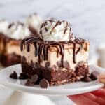 - Serve: Use the foil to lift the brownies out of the pan. Cut into 15 bars and optionally drizzle with melted chocolate bark. Serve as is or garnish with whipped cream, chopped peanuts, chocolate chips, or Reese’s Pieces if desired.