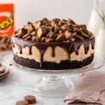 - Assemble Cake: Pour the chocolate batter evenly over the peanut butter layer. Then sprinkle the mini peanut butter cups and chocolate chips evenly on top. They will sink slightly during baking creating pockets of melty goodness.