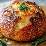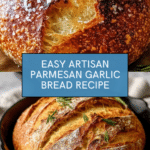 This Perfect Parmesan Garlic Bread recipe features an easy artisan-style loaf made with simple ingredients like parmesan cheese, garlic, and fresh herbs. The dough is left to rise overnight for a light, airy texture, then baked in a hot Dutch oven for a golden crust and tender crumb. A fragrant, cheesy, and savory bread perfect for any meal or snack.