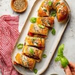 - Garnish and Serve: Once baked, tuck the fresh basil leaves into the bend of the candy cane to act as a decorative bow. Slice into portions and serve warm with extra pizza sauce on the side for dipping.