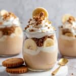 3. Assemble the pudding: In jars or serving cups, add a layer of the pudding mixture at the bottom, followed by crushed vanilla wafers, then a layer of banana slices. Repeat these layers to create two complete sets of pudding, wafers, and banana.