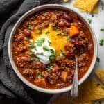 - Adjust seasoning and serve: Taste the chili and adjust salt and pepper as needed. Serve hot with optional garnishes such as roasted pumpkin seeds, sour cream, shredded sharp cheddar cheese, and slices of avocado for creamy richness and texture contrast.