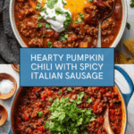 This hearty Pumpkin Chili combines spicy Italian sausage with the rich flavors of pumpkin puree, fire-roasted tomatoes, and a blend of warming spices. It’s a comforting one-pot meal perfect for chilly days, packed with protein and fiber from beans and seasoned to perfection with cumin, chili powder, and a hint of cinnamon. Garnish with roasted pumpkin seeds, sour cream, shredded cheddar, and avocado for an extra layer of flavor and texture.