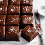 A square tray of twelve chocolate cake pieces is shown on a white marbled surface, with each piece topped with a smooth, thick layer of dark chocolate frosting sprinkled with small flakes of sea salt. One piece is slightly lifted to reveal a moist, dark chocolate cake layer beneath the frosting. To the right side lies a silver knife with chocolate frosting residue on the blade, and a white dish with coarse sea salt is partially visible above the knife. Photo taken with an iphone --ar 4:5 --v 7