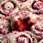 Keywords: red velvet cinnamon rolls, cinnamon rolls, red velvet recipe, cinnamon roll frosting, breakfast pastries, cream cheese frosting