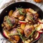 This Rosemary Apple Cider Chicken is a flavorful and comforting dish that combines tender bone-in chicken thighs with a fragrant blend of herbs and spices, caramelized apples, and a rich apple cider sauce. Perfectly seared and baked in one skillet, it offers a delightful balance of savory and sweet with fresh rosemary and honeycrisp apples.