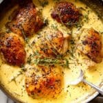 The image shows a skillet filled with five pieces of golden-brown chicken thighs in a creamy yellow sauce. The chicken has a crispy, slightly charred texture on the skin with black pepper specks. Fresh green thyme sprigs lay on top of the chicken, adding touch of color. The creamy sauce is rich and smooth, covering the bottom of the pan and partly the chicken. A silver utensil is resting on the right side, partially in the sauce near one chicken piece. The pan is sitting on a white marbled surface. photo taken with an iphone --ar 4:5 --v 7