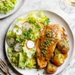 A white plate featuring a meal with three main layers: on the left side, a fresh salad with light green lettuce leaves, thinly sliced white radishes with red edges, and chopped green onions scattered on top; in the middle, a large piece of chicken breast covered with glossy brown gravy and sprinkled with finely chopped green herbs; on the right side, several roasted baby potatoes with a golden-brown color, also topped with small bits of green herbs. The plate rests on a white marbled surface, next to two vintage silver forks and a glass of white wine. Photo taken with an iphone --ar 4:5 --v 7