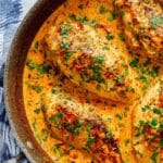 A close-up view of four cooked chicken breasts in a pan filled with a thick, orange creamy sauce that has small red and white bits inside. The chicken breasts are golden brown with slight charring and are sprinkled with chopped green herbs on top. The pan edge is visible and sits on a white marbled surface with a blue and white striped cloth nearby. photo taken with an iphone --ar 4:5 --v 7