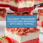 Delight in these luscious Strawberry Cheesecake Brownies featuring a moist strawberry cake base, topped with creamy strawberry-infused cheesecake frosting and sprinkled with a crunchy strawberry Oreo crumble for a perfect blend of flavors and textures.