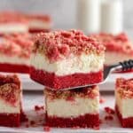 The image shows a square piece of dessert with three clear layers held by a spatula. The bottom layer is a firm, bright red cake with a smooth texture. Above it is a middle layer of thick, creamy white filling, looking soft and dense. The top layer is crumbly and textured, made of small red and light brown crumbs, adding a crunchy look. The piece is in front of several similar squares laid on white parchment paper on a white marbled surface, with some crumbs scattered around. The background is blurred with hints of more dessert pieces and two glasses of milk. photo taken with an iphone --ar 4:5 --v 7
