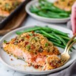 This Sun-Dried Tomato Parmesan Crusted Salmon recipe features wild salmon filet topped with a flavorful crust made from sun-dried tomatoes, fresh basil, garlic, and parmesan cheese. Roasted alongside fresh green beans, this dish offers a balanced, nutritious, and delicious meal ready in under 30 minutes.
