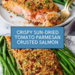 Keywords: salmon recipe, sun-dried tomato crust, parmesan crusted salmon, baked salmon, healthy salmon dinner, roasted green beans