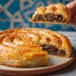 This Turkish Spiral Börek with Spiced Ground Beef is a savory pastry featuring a flavorful filling of gently spiced ground beef enveloped in crisp, golden phyllo dough. The filling is seasoned with Aleppo pepper, black pepper, and salt, simmered to juicy perfection, then wrapped in thin layers of phyllo brushed with a milk and egg mixture and topped with sesame and nigella seeds for added crunch and aroma. Perfect as a hearty appetizer or main dish, this recipe captures authentic Turkish flavors with a satisfyingly flaky texture.